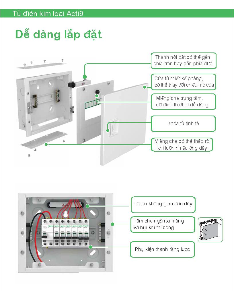 - Tối ưu không gian đấu dây, tấm che xi măng và bụi khi thi công, phụ kiện thanh răng ngược