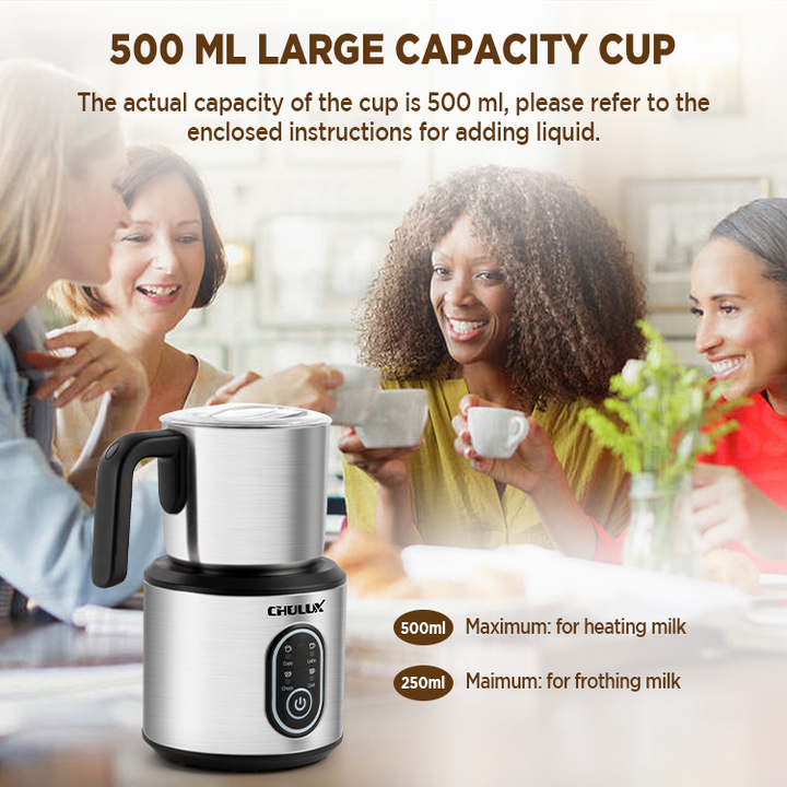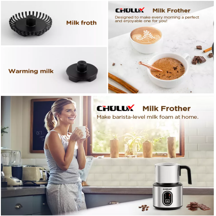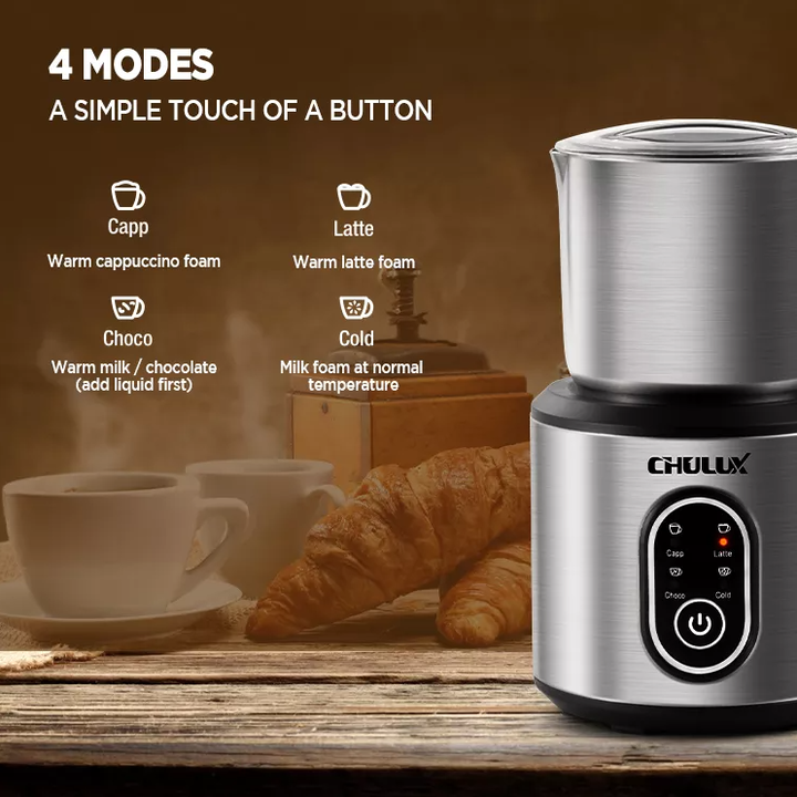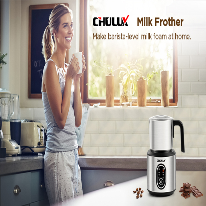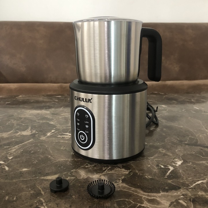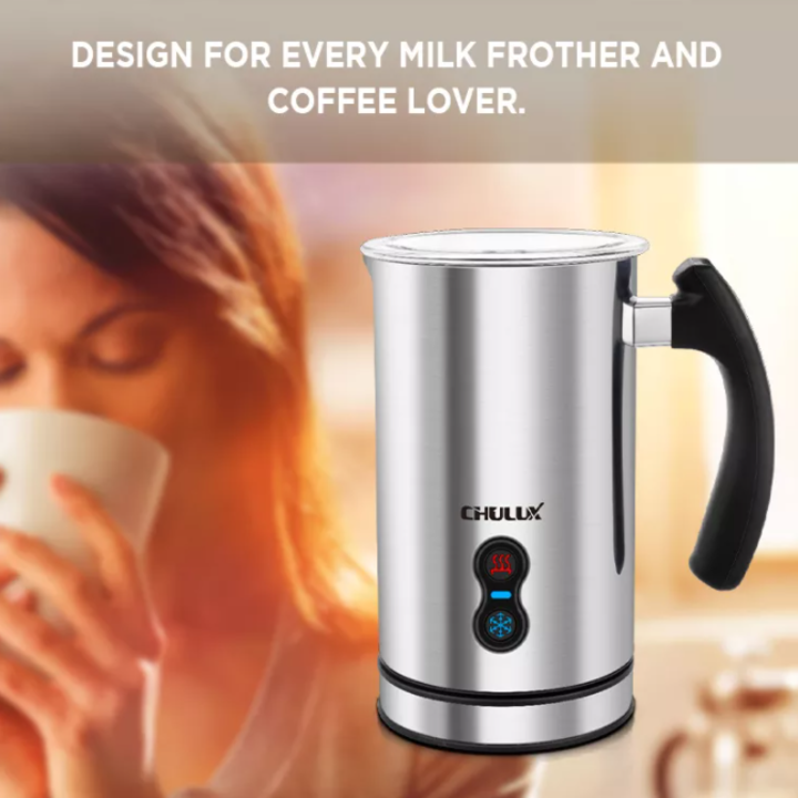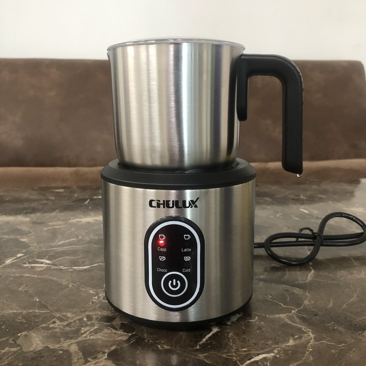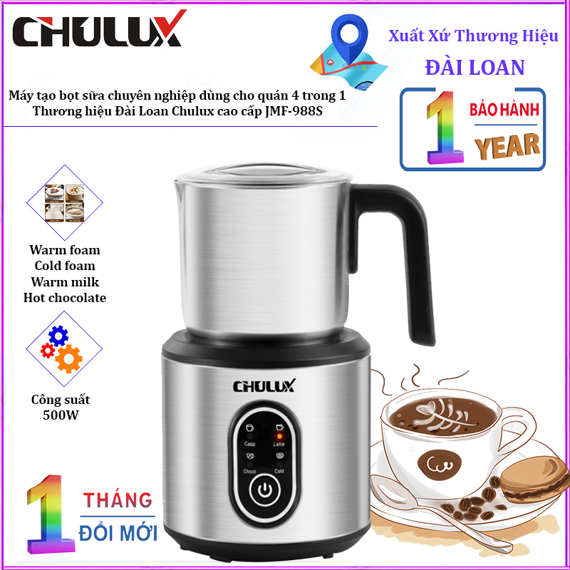 - Máy tạo bọt sữa chuyên nghiệp dùng cho quán 4 trong 1 Chulux JMF-988S là sản phẩm cao cấp chuyên dùng cho quán cà phê, dùng để đánh sữa tạo bọt và pha các loại thức uống nóng lạnh. Máy sở hữu dung tích lớn, tốc độ mạnh, không phát ra tiếng ồn, dung tích lớn, thiết kế sang trọng.
