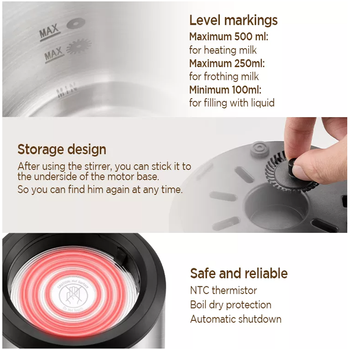 - Máy tạo bọt sữa được làm bằng inox cao cấp 304, dày dặn; siêu bền bỉ và hoàn toàn chống han gỉ. Bề mặt inox được phủ thêm lớp chống dính giúp bạn dễ dàng vệ sinh.
