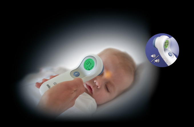-Nhiệt kế đo trán Braun NTF3000 giúp theo dõi nhiệt độ cho bé dễ dàng mà không làm ảnh hưởng đến giấc ngủ của bé.