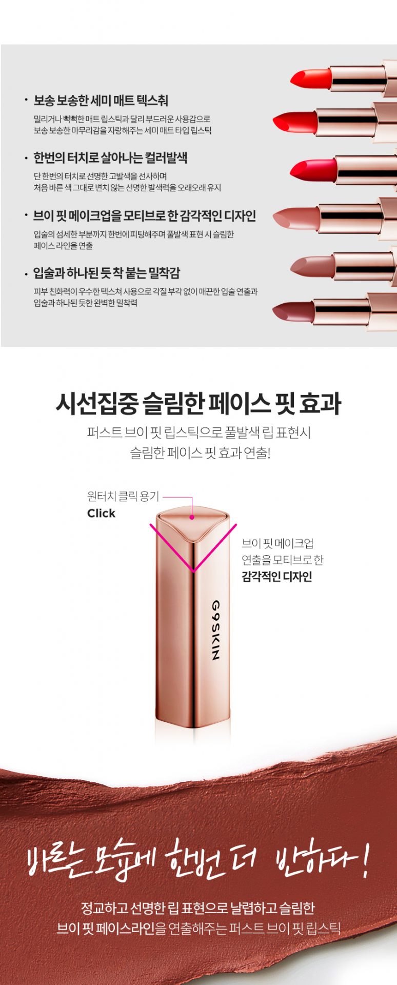 - G9 SkinFirst V-Fit Lipstickđược đánh giá rất cao ở kết cấu son vô cùng hoàn hảo. Chất son khi lên môi rất mịn, mượt, khắc phục được hầu như những điểm yếu củadòngson lìtruyền thống như: dễ gây khô môi, bong tróc da, chất son bị bột không bám lâu và gây nặng môi,…